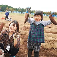 広々とした畑でおいもを掘り起こす